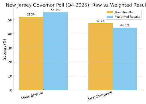The raw responses show a narrow edge for Sherrill, reflecting strong participation from Democratic-leaning respondents in our digital sample. When adjusted to reflect New Jersey’s 2024 electorate (Harris 57 %, Trump 42 %), the results slightly widened in Sherrill’s favor, showing a consistent but modest Democratic advantage. This difference between raw and weighted results illustrates Realtime Research’s ability to distinguish natural digital enthusiasm from true electoral strength.