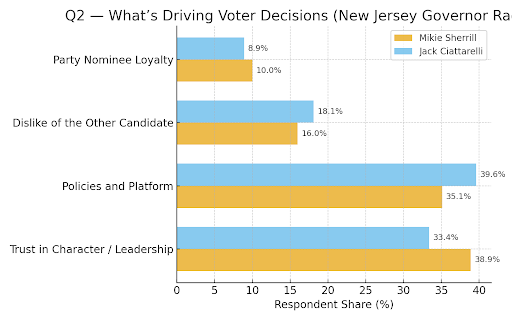 Mikie Sherrill’s supporters tend to emphasize trust and character, while Jack Ciattarelli’s backers focus more on policy issues. Both sides display moderate negativity toward the opposing candidate, but overall motivations remain anchored in perceived leadership quality and agenda alignment. This indicates a contest driven more by issue-based decision-making than by party identification.