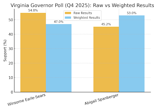 The raw responses show a lean toward Earle-Sears, reflecting stronger participation from Republican-leaning respondents in our digital sample. However, when adjusted to reflect Virginia’s 2024 electorate (Harris 53 %, Trump 45 %), the results shift to a Spanberger +6 lead, aligning with recent public polling. This gap between raw and weighted results demonstrates Realtime Research’s power – showing not only where public sentiment stands, but also how participation biases appear before weighting corrections.